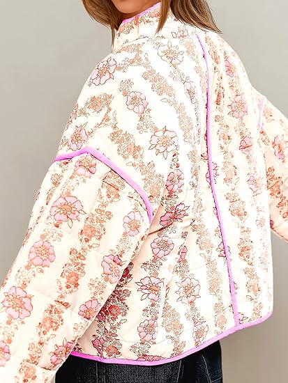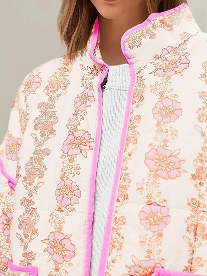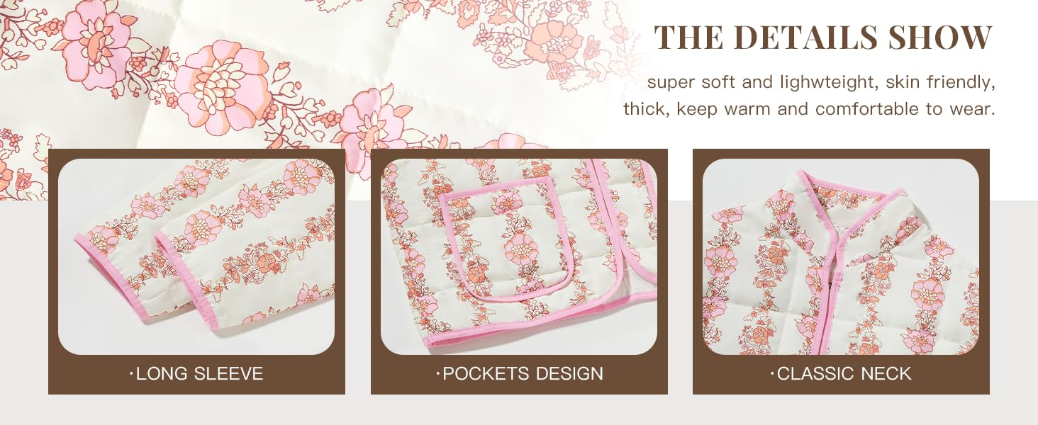 Material: Polyester blend. Floral open front short padded quilted jacket, super soft and lighwteight, skin friendly, thick, keep warm and comfortable to wear.